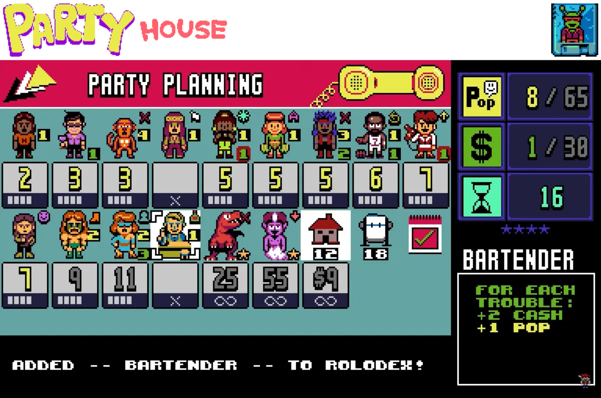 Party House is a deckbuilder (if you’ve played Dominion, Ascension, or any of the other 5 bajillion deckbuilding games out there, this is similar), but the “cards” are people that you’re inviting to a party at your place. You have 25 days to throw the perfect party.