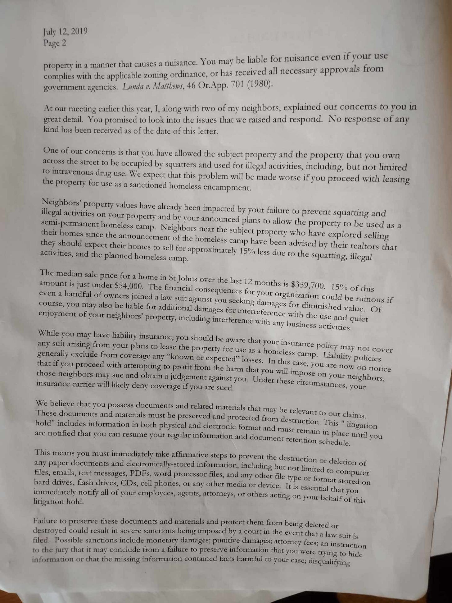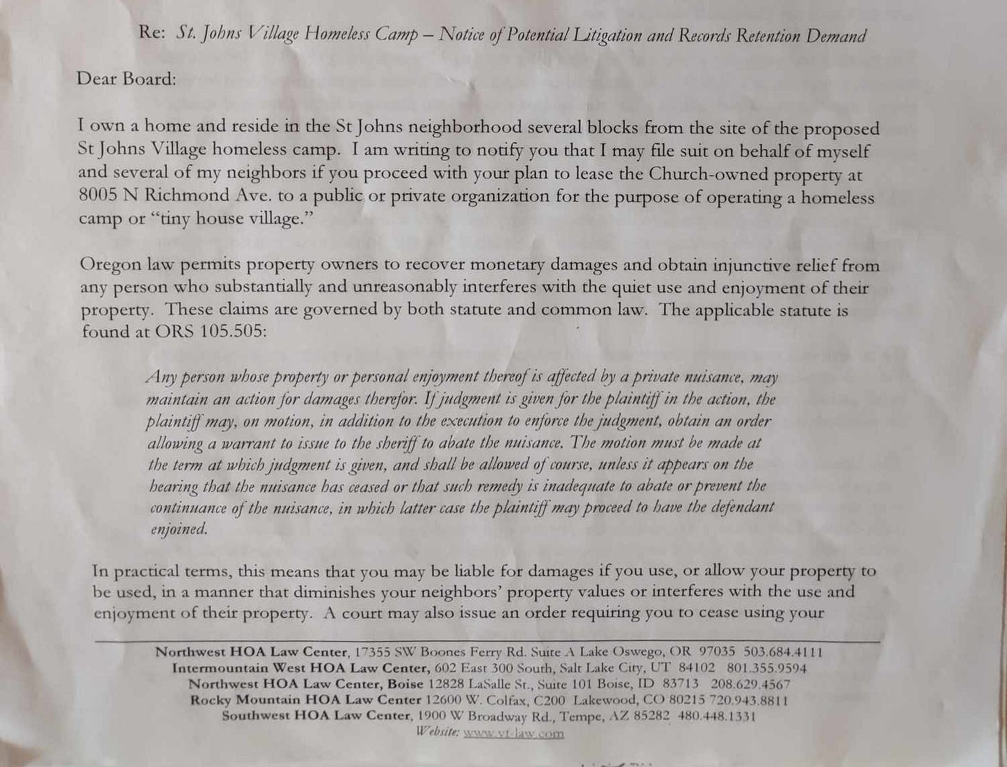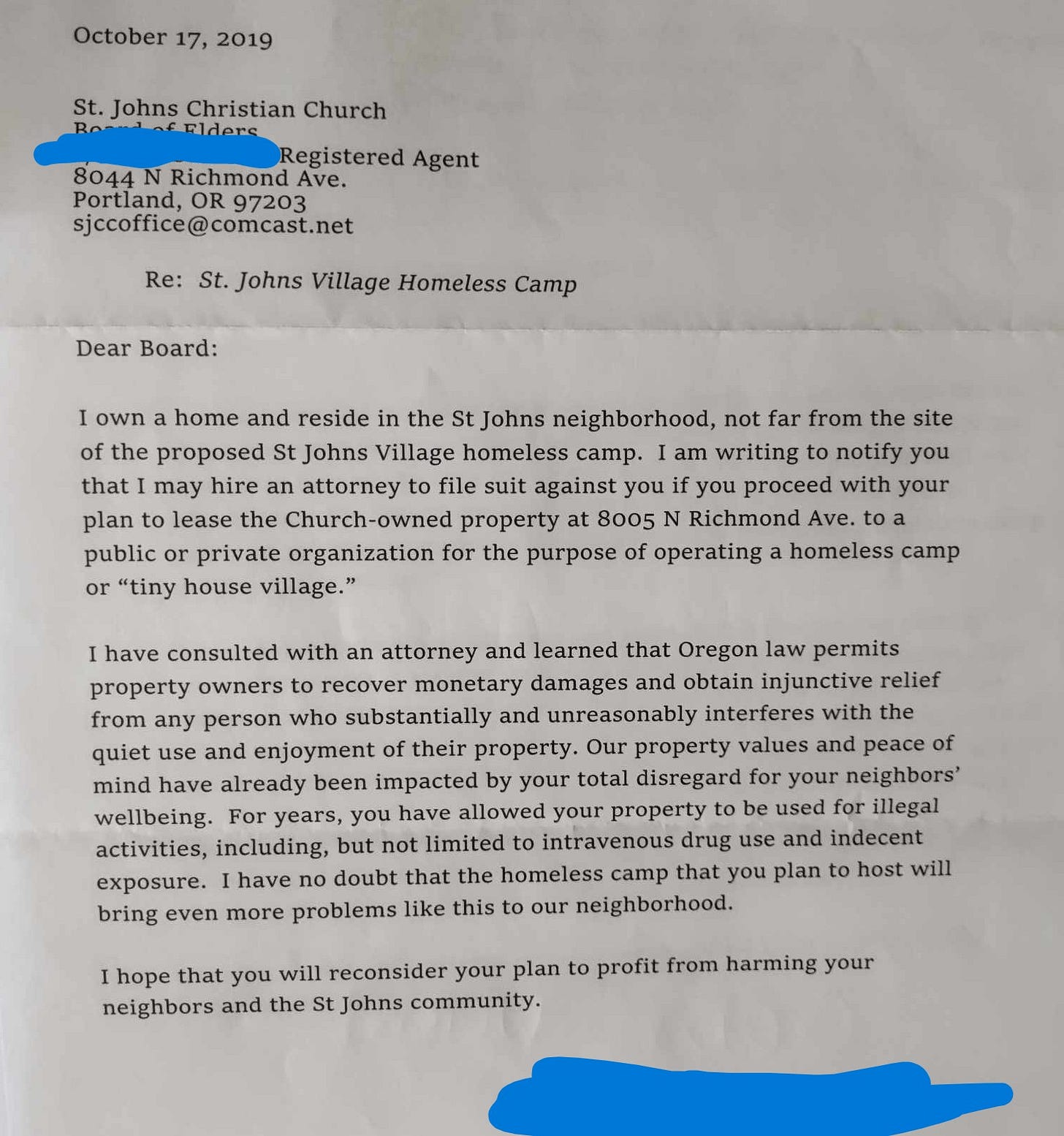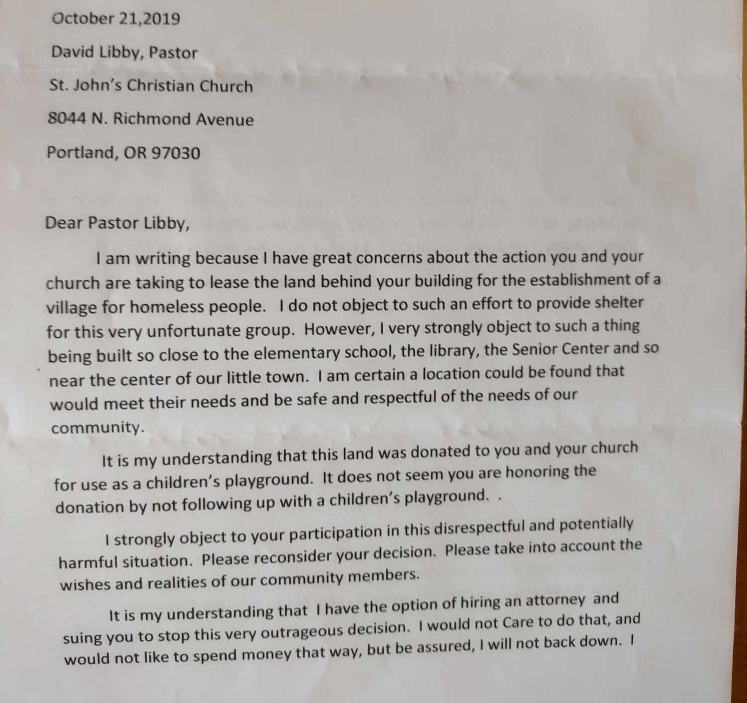 Let me show you just four of the more than a hundred lawsuit threats that our church received when we were working on housing for houseless folks on our property. Note that these buildings are tiny homes, built professionally, with a large community building that has a kitchen, laundry, and bathrooms, with a large wooden fence around the whole facility, a no drug policy, and case workers on site.