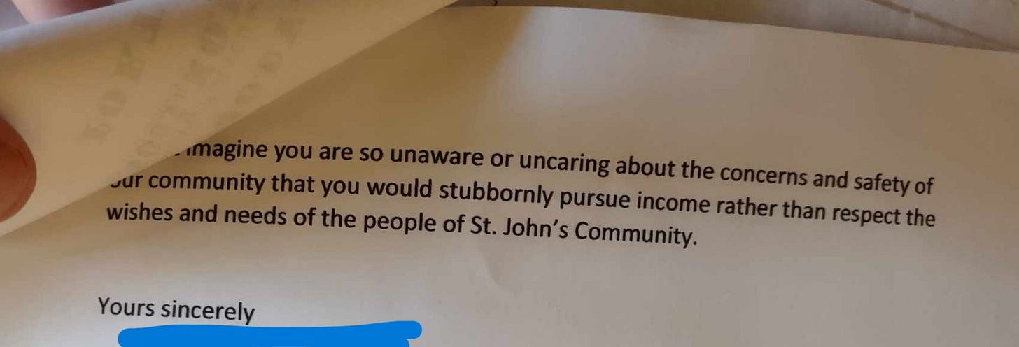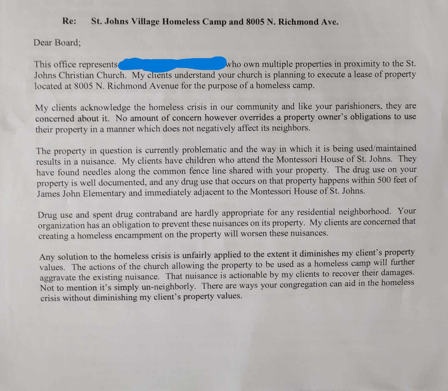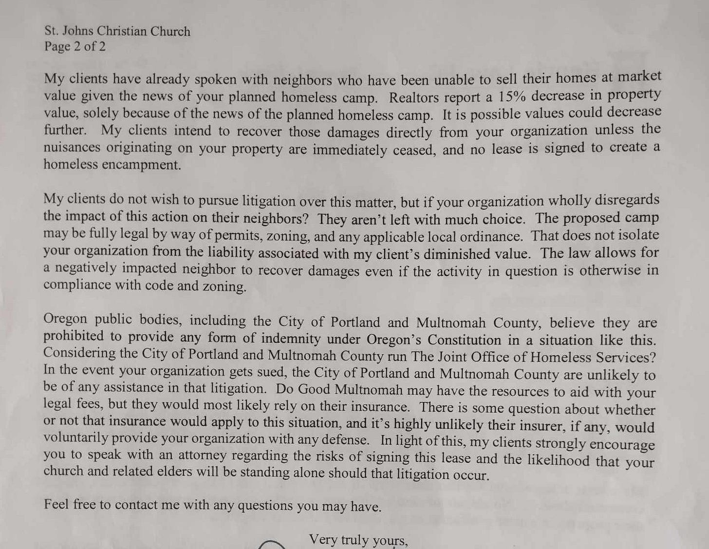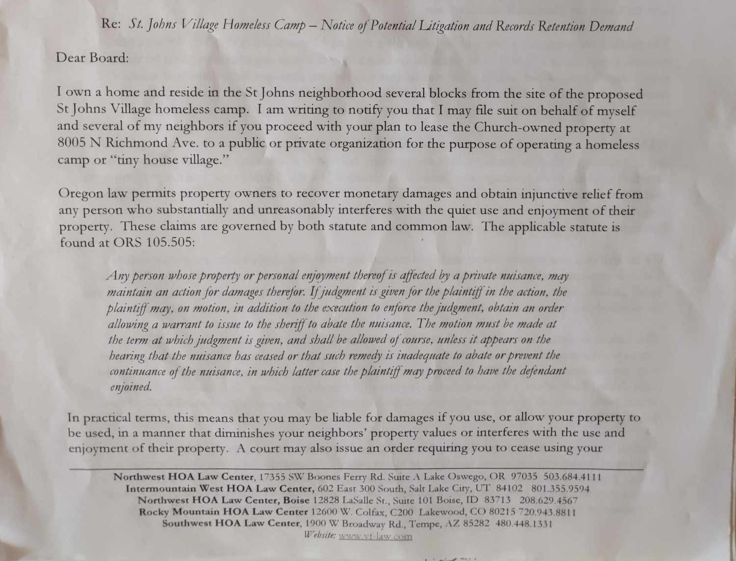 Let me show you just four of the more than a hundred lawsuit threats that our church received when we were working on housing for houseless folks on our property. Note that these buildings are tiny homes, built professionally, with a large community building that has a kitchen, laundry, and bathrooms, with a large wooden fence around the whole facility, a no drug policy, and case workers on site.